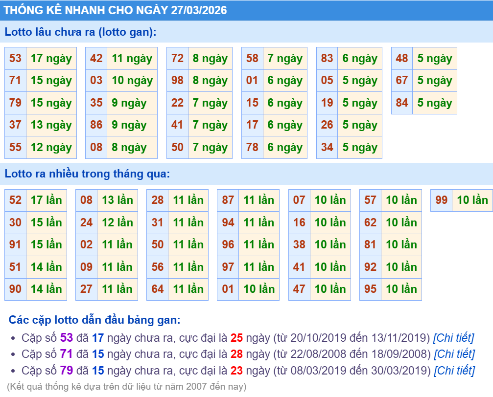 Thống kê lô gan XSMB ngày 27/03/2026